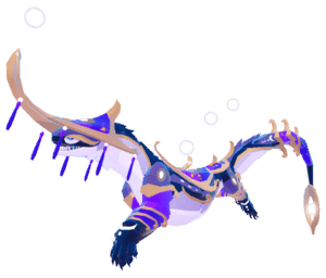 Amolis has a grounded, sturdy build that thins towards the waistline. It has thick forearms and thin feet accompanied by a long tail. It has golden rib-like armor plates on its body, golden curves on its limbs, and a golden crest on top of its head, similar to a horn beetle. Amolis has multiple orbs floating around its body: three above the plates on its back and one hovering in the middle of the oval-shaped ring at the end of its tail.
