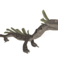 The Boskurro is a quadrupedal creature that has a forward-leaning body, shifting its weight onto two incredibly thick, widely spread armored forearms that are used to spread its weight around like snowshoes and hold up a long neck adorned with large and pointed, petal-shaped spiked plates of armor leading up to a small face with beady eyes and a unique crest shaping the chin and extending upwards atop its snout with two tusk-like teeth on either side of its head. Its back legs are significantly smaller, and further down, it has a row on top and below the tail comprised of dull yet large spikes. Around the tail, front and back legs, and head are green-colored floating orbs. It consists of light and dark blue-greens and light and dark browns. Its jaw consists of outwards-facing teeth, as well as a long, thin, flat dark-bluish green tongue and tipped beak to support its omnivorous diet.