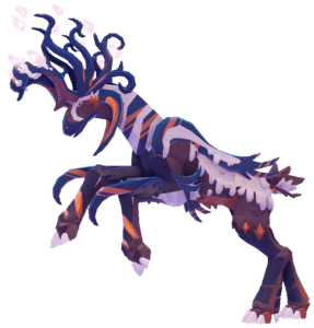 The Cenicara is a quadrupedal, primarily brown creature with orange and black accents that resembles several members of the cervid family. Its four legs each bear hooves, with the front legs having three toes and the hind legs having five. Eight large, curving horns that appear to have candles with wisps of flame at their tips sprout from the top of its head. Off-white wax drips from its back and on its antlers. It has tufts of fur in the same color on its tail and shoulders. Its eyes are yellow with rectangular pupils, similar to those of goats and sheep. Large tufts of fur run from the nape of its neck to its chest. Its neck also has orange, black, and white-molten-wax-like striped markings. A scythe sprouts from above the foot of both of its front legs. On its flanks, it has two small, red ribbons in the shape of a bow. It has a graceful, slender body and skinny legs.