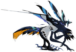 The Corvurax is a large, vulture-like creature with two small arms located on the underside of its upper torso, and two large, somewhat bulky legs. It's mostly black and grey in color, with colorful accents of blue, green, and purple seen throughout it, as well as bright orange on the underside of its tail. The Corvurax has very slim, yet long wings, which bear a repeating pattern of circles. Its feet are reminiscent of the modern-day crow. It has four glowing yellow eyes, two on its lower jaw, and two on its head.