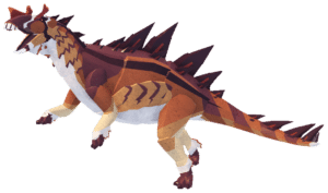 The Dragonixsauria is a dinosaur-like creature with horns on its back, a large body, and spikes along its tail. The creature has a several frills under its head and a small crest on the top of its nose and small protrusions above its eyes. On its neck, there are a couple of scales. The Dragonixsauria's appearance resembles a Shantungosaurus or another type of Hadrosauridae, a group of herbivorous dinosaurs classified for their characteristic duck-like beaks and crests found on some of their heads. It also has large sails running down the length of its back, ending where its tail starts and continuing near the end of its tail, resembling those of Stegosaurus or another type of stegosaurian dinosaur.