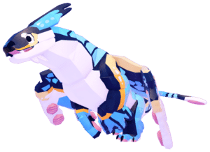 The Gobli is a small, winged creature about the size of a player's avatar. It has a pair of short and round wings on its back that are structured much like a bat's, having prominent beans at the end of each digit/'finger'. The Gobli also have arms that resemble its wings, with webbed fingers, though they are smaller and don't have as much webbing between them. It also has stumpy, tortoise-like hind legs and a large tail ending in a toe bean. Its head presents a pair of two-pointed-ears, a snout, a mouth with two pairs of slightly curved conical teeth and cartoon-y, large eyes with white sclera and a black iris and pupil. The Gobli's color palette consists of yellows, pink, white, black, and mainly various ombré shades of blue.
