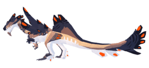 The Gyroudus is a huge theropod, partially resembling the carcharodontosaurid theropods Concavenator and Giganotosaurus, with large spikes protruding from the spine and tail, imitating a form of rock or bark. It also has a build similar to that of advanced prehistoric theropods like the Giganotosaurus, with small arms and heavy legs. Gyroudus is decorated in tan, white, green, grey, and brown, with glowing orange spots. It has large jaws equipped with exposed teeth from the upper jaw and a pair of beady, orange eyes. The base of its head ends in a hood of spikes and a pattern of plates going down the neck. Its tail starts with a large sail, arching up then stooping down to the tail where the end expands into a paddle.