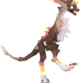 The Hallucinix is a quadrupedal, black-grayish, shadowy maned wolf-like creature with four detached paws. It has a red crack-like pattern on its underbelly that spreads outwards into smaller cracks, and four golden, spiky, ring-like objects attached to its upper back. There are four small red eyes on both sides of its head, with a larger eye in between them. In the middle of its head, it has an even larger eye, as well as one floating in its mouth. Its tail is shaped like a fern, with a kite-shaped marking near the tail tip, containing more of the same red color seen on its belly. On its head, it has two black horns. It also has five pairs of tendril-like wings hovering above both sides of its back, with each pair decreasing in size. These wings also have a red pattern, and at the end of each wing are claw-like shapes arranged in threes, except for the first pair, which has twos.