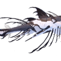 The Imeaorn is a bipedal creature. Its two massive, pillar-like forelimbs end in backward facing claws. Smaller arms protrude from where the forelimbs meet the abdomen. Its incredibly long jaw almost seems to extend into its own neck, while its two sets of eyes sit on the tip of the head. The marking on its face somewhat resembles a skull or mask. Various flaps and spikes span the length of the Imeaorns' body, particularly on its neck and tail. Additional striped markings decorate the flaps as well as the legs and neck.