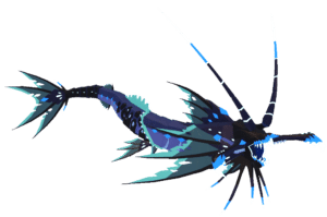 The Kohikii resembles a mix between a bobbit-worm, the spotfin lionfish, and some horror movie worms. There is one pair of bobbit-worm-like pincers by its extended terminal mouth, two antenna-like appendages on top of its head and several shorter antenna appendages stemming from the bottom of its maxilar. It presents a body with a triple dorsal fin (with the first dorsal fin being the biggest, and the two others being slightly rounded and looking like a gear, with the second dorsal fin being connected to lateral-line protrusion folds), two huge pectoral fins stemming almost from the sides of the mouth, two smaller pelvic fins, an spiny anal fin aligned and symmetrical with the third dorsal fin, and on the distal part of the tail, small finlet-like protrusions and a 3-finned homocercal caudal vertical tail (with the first lower and upper fin pair being reduced to spiny rays, and the second fin pair being more open than the final, third caudal tail). Some bioluminescent diamond and plate-like details cover their bodies.