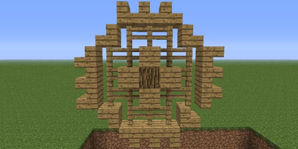 As you can see in the example, we’ve set up our basic house outline again, but we’ve added 2 small fenced of gardens next to the door. These fences play a key role in blocking the player, without looking suspicious. Note that 1 side of the garden has been removed, as it obstructed the view on the redstone below.