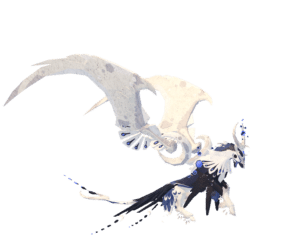 Moluna is a bovine-like creature, most closely resembling an ox. It has four slim legs, all of which end in a hoof. The Moluna bears several clusters of feathered plumes, most noticeably on its rear forming a bird-like tail, as well as on its shoulders. Its tail-like feathers are accompanied by a long, slender tail ending in a dip. Moluna has two large wings, one on each side of its body. Its wings consist of several floating pieces, the main piece most notably resembling the shape of a crescent moon. The moon motif is seen several times on the creature, being featured in several phases as markings upon Moluna as well as floating decorations as part of its tail. Similarly to the rest of its features, the Moluna's head is slim, and bears two sets of horns resembling the same crescent/decrescent moon phase. Its base color palette consists of warm shades of off-white accompanied with varying shades of dark blue.