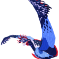 The Nakamaska is a slim creature with a head covered in hard plating that presents a third eye. It has two clawed arms, two legs with long talons, two pairs of webbed leathery wings of which the biggest pair is also used as frontal legs, and a tail covered in plated armor reminiscent of axes. Its face armor also protrudes into four horns, two from the top of the head and two on the sides of the jaw. Its horns, tail, and shoulders are heavily patterned with black stripes, while its neck possesses a mane, and more eye-shapes can be found on its shoulders.