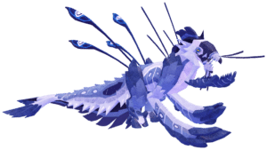 The Polymonstrum has a thin build with long, mantis shrimp-like arms tipped with three large, upward facing claws. The head has two large antennae, a narrow beak-like mouth, and eyes situated along the bottom jaw. Along the back are a few large, striped spikes and clusters of blue angular bumps along the back. It has a lobster-like tail to help it swim. Two smaller mantis arms on its lower jaw help it carry food. This creature's colours consist of dark and light blues, black and white.