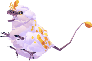 The Puffwump is a small, bipedal creature thats appearance seems to take inspiration from raptors. The majority of its body is covered in thick feathers and down, so much so it looks like a cotton ball. It has small arms and skinny legs that stick out of its fluff. It also has a long, thin featherless tail, with a clump of feathers on the tip. The body is white, with some patches of orange-yellow on the body, and a fully orange tail fan. Its skin is grayish shade of brown, with small darker brown freckles on its beak.