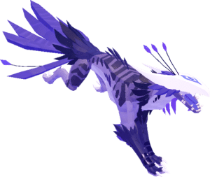The Saikarie is a quadrupedal white-masked creature with a symbol on its mask that resembles an eye. Where its tail should be, a mane and plumes appear, its body is covered in feathers and fur. It has two feathers on the base of its rear legs beneath its plumes and three feathers that resemble antennae on the back of its head. On the sides of its torso, it possesses holes that resemble gills.