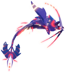 The Slaiorn has a teardrop-shaped body, with a rounded torso that thins from the lower torso to the tail tip. On the tail's tip is a battle-axe-shaped feature with a pair of pointed pincer-like shapes appearing on the end. Large scales cover the back with its face placed low along the front end with thick, short horn-like features protruding from the creature's forehead. There are several floating details spread across the base of the body, tail's end, and similarly-shaped thin strips attached to the face. Its 3 pairs of eyes are actually located in their lower jaw. In front of its face is a long floating piece that curves toward the body and a duplicate shape flipped vertically that bends below the creature's face. On its sides, it has thick flipper-like limbs with floating rings around the fin tips. On the upper floating piece in front of the creature's face and the pincer-like shape on the tail tip are small, red floating orbs. It consists of reds, yellows, and light and dark grays.