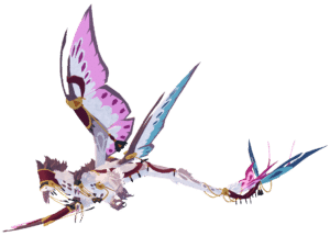 The Sylvesqual is a regal bird-like creature adorned with royal ornaments, such as royal cloth, tassels, and interwoven pieces of fabrics fashioned to cover most of its body. Its default colors consist of different shades of brown, pink, blue, purple, yellow, and white, with the main body being mostly different shades of brown fur with a white underbelly, and the ornaments being blue, purple, and yellow. It sports three heads with long beaks, with the other two being smaller in size (located on the shoulders) compared to the main head. The main head has one blue and one pink "hood" with draping tassels on top its head, and the other two having one blue one with tassels as well. It has only two arms with bird-like fingers/toes: two in front, one in back. Sylvesqual also has four wings: a pair of large wings with some pink coloration, and another smaller pair of wings with some blue coloration. The creature has a long, thin whip tail that ends in four pairs of blue and pink tail fins of different sizes.
