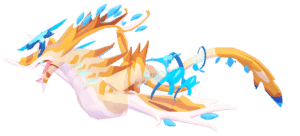 The Valkyrie is a long, whale-like creature that is cream, orange, and gold in color. There are what appear to be blue coral-like structures on its horns, around its tail, and on its forehead. It has sharp white teeth and a light pink tongue. The shape of its jaw resembles the headdress of the Valkyrie from Norse mythology.