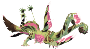 The lower jaw of Venuella splits into Venus flytrap-shaped parts. When held together, they resemble a throat pouch, as well as the pitchers of tropical pitcher plants specifically. Several needle-sharp teeth protrude from Venuella's mouth, and its short snout ends in a beak. On its back are parallel sails that are also lined in spines. The entire creature's body features striped patterning and occasional spotting, and it is colored various shades of green and pink by default.